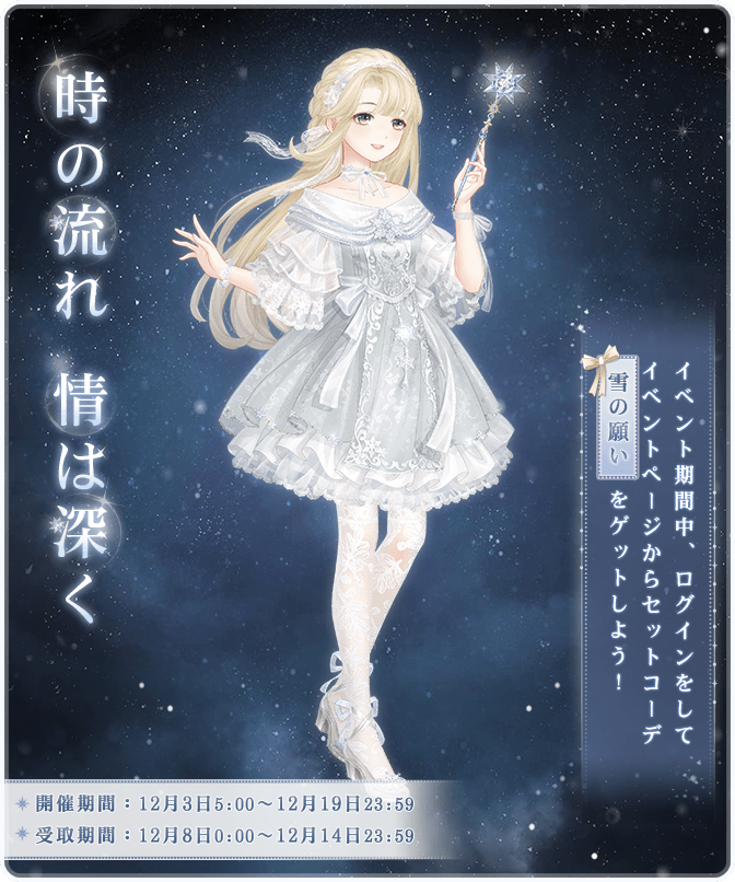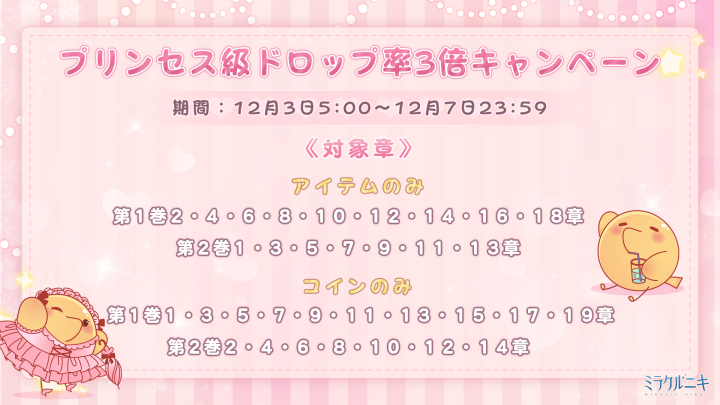 『星光の残響 旧宴の恩恵』開催! ![]() イベントページ「星の墜ちる地」から様々なイベントに参加し、豪華なセットコーデや報酬をゲットしよう! 「過去の夢影」を進めて秘密情報を集めると 背景「夜に耽る」が獲得できます! ![]() 【イベント①】『旧宴の恩恵』 ▼期間:12月3日5:00~12月19日23:59 ▼内容:神々の秘密をガチャで語り継ぎ、豪華なセットコーデを獲得しよう! 『旧宴の恩恵』にて伝説を知るに進むと、超レアLive2Dコーデ『夢の囁き』を獲得できます! イベント期間中、お得な神々の秘密BOXも販売されます♪ ※ランキング報酬の受取は12月20日23:59まで ![]() 【イベント②】『運命の黄昏 永遠の祝福』 ▼期間:12月3日5:00~12月19日23:59 ▼内容:イベントにて指定のガチャ回数で豪華報酬をゲットしよう! イベントページから黄金の栄光を開放すると セットコーデ『光の恵み』と追加報酬を獲得できます! ![]() 【イベント③】『時の流れ 情は深く』 ▼開催期間:12月3日5:00~12月19日23:59 受取期間:12月8日0:00~12月14日23:59 ▼内容:イベント期間中、ログインをして、イベントページからセットコーデ『雪の願い』をゲットしよう! ![]() 【イベント④】『時の軌跡』 ▼期間:12月3日5:00~12月19日23:59 ▼内容:期間中、ミッションを達成して、セットコーデ『夢追う心花』と豪華報酬を獲得しよう! ![]() 【イベント⑤】『星に願う』 ▼期間:12月3日5:00~12月19日23:59 ▼内容:イベント期間中、チャージをして紅封筒を獲得しフレンドやギルドメンバーに贈ろう! マーベル大陸の仲間から紅封筒も届くよ! ※フレンド、ギルメンからの紅封筒は24時間以内に受け取らないとモモの焼肉代になります ![]() 【イベント⑥】第17回光のギャラリーコンテスト ▼期間:12月3日5:00~12月19日23:59 ▼内容:光のギャラリーであなただけの旧宴の恩恵を記録しよう! 期間中にコーデを投稿するだけでエントリーが完了し、参加特典がもらえます! トップ50にランクインすると豪華報酬が獲得できます! ![]() ![]() ![]() 【イベント⑦】『奇跡の島』 ▼期間:12月3日5:00~12月19日23:59 ▼内容:チャージをして星曜石を獲得し、使用して、奇跡の島で豪華なセットコーデをゲットしよう! 同時に豪華なセットコーデも復刻販売します! ※連邦商事の商品及び日替りBOXも対象 ![]() 【イベント⑧】プリンセス級ドロップ率3倍キャンペーン ▼期間:12月3日5:00~12月7日23:59 ▼内容:期間中、プリンセス級の対象章でアイテムやコインのドロップ率が3倍になります! 《対象章》 アイテム:第1巻偶数章・第2巻奇数章 コイン:第1巻奇数章・第2巻偶数章 ![]() 【イベント⑨】8周年日替ログインボーナスキャンペーン ▼期間:12月3日5:00~12月10日23:59 ▼内容:ログインすると、イベントページから毎日日替りで豪華報酬がゲットできます! 12月8日にはアイコンフレーム【星海の記憶】プレゼント! ※お一人様1日1回限り ![]() 【イベント⑩】限定モモガイドイベント ▼期間:12月4日5:00~12月16日23:59 ▼内容:期間内にセットコーデ『光と影』を完成させ、豪華報酬を獲得しよう! Twitter限定のおトクキャンペーン情報などもお送りするので、 お見逃しないようぜひフォローをお願いいたします! https://twitter.com/miraclenikkijp 『ミラクルニキ』運営チーム |