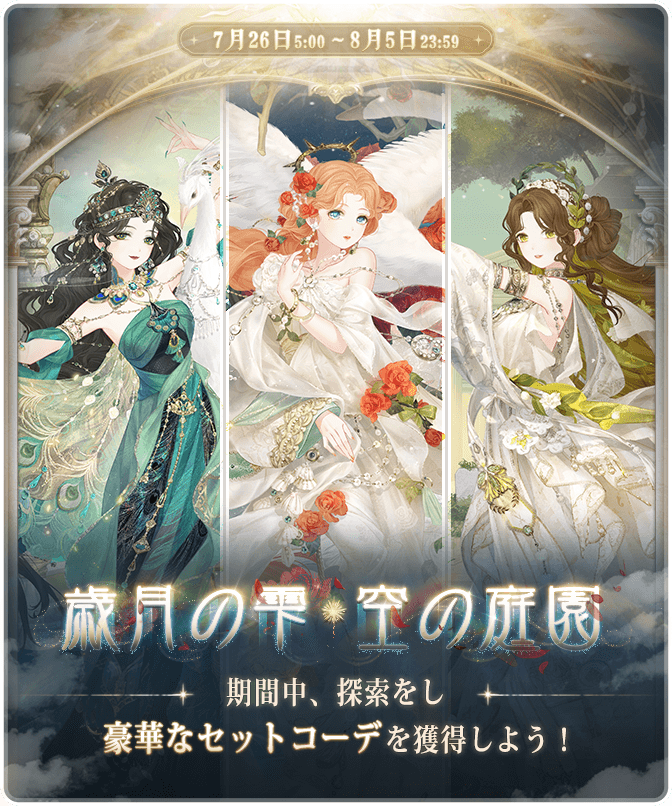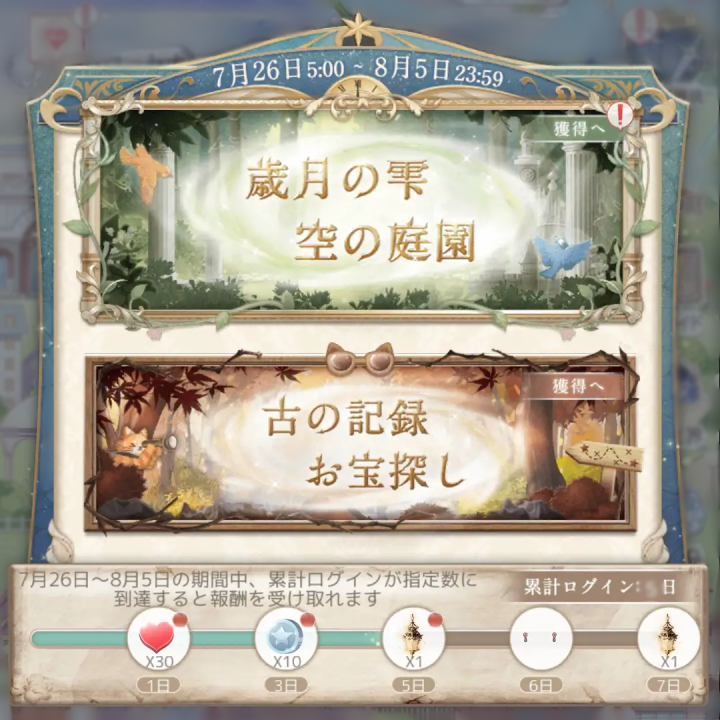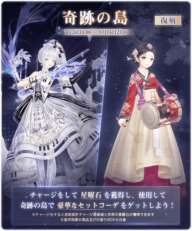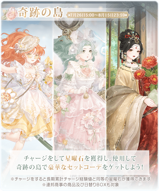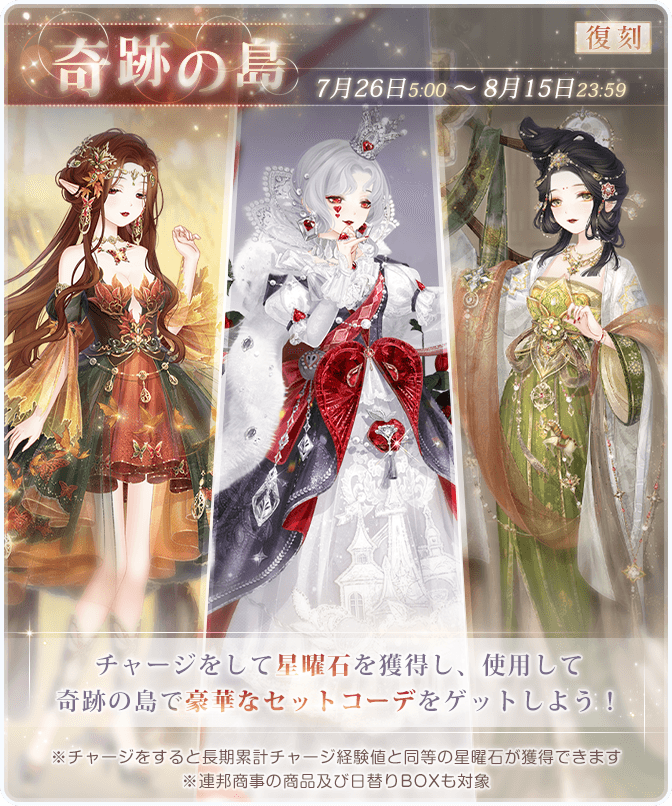 『空の庭園』開催! ![]() 【イベント①】『空の庭園』 ▼期間:7月26日5:00~8月5日23:59 ▼内容:イベント期間中、様々なイベントに参加し、豪華なセットコーデを獲得しよう! 累計ログインが指定数に達すると報酬が受け取れます! ![]() 【イベント②】『歳月の雫 空の庭園』 ▼期間:7月26日5:00~8月5日23:59 ▼内容:期間中、探索をし豪華なセットコーデを獲得しよう! イベント期間中、お得な昔日の宵灯BOXも販売されます♪ ![]() 【イベント③】『古の記録 お宝探し』 ▼期間:7月26日5:00~8月5日23:59 ▼内容:通常マップで地図の断片を集め、限定セットコーデと交換しよう! イベント期間中、お得な地図の断片BOXも販売されます♪ ![]() ![]() ![]() 【イベント④】『奇跡の島』 ▼期間:7月26日5:00~8月15日23:59 ▼内容:チャージをして星曜石を獲得し、使用して、奇跡の島で豪華なセットコーデをゲットしよう! なお同時に過去に販売したセットコーデも復刻販売されます! ※連邦商事の商品及び日替りBOXも対象 【イベント⑤】お得BOX ▼期間:7月28日5:00~8月5日23:59 ▼内容:期間中、80円で下記豪華報酬をゲットしよう! ■30ダイヤ ■180体力 ■15スターコイン ■20ギルドコイン ※お一人様5個まで 【イベント⑥】プリンセス級ドロップ率3倍キャンペーン ▼期間:7月31日5:00~8月4日23:59 ▼内容:プリンセス級の対象章で獲得できるアイテムやコインのドロップ率が3倍になります! 《対象章》 アイテム:第1巻偶数章・第2巻奇数章 コイン:第1巻奇数章・第2巻偶数章 Twitter限定のおトクキャンペーン情報などもお送りするので、 お見逃しないようぜひフォローをお願いいたします! https://twitter.com/miraclenikkijp 『ミラクルニキ』運営チーム |