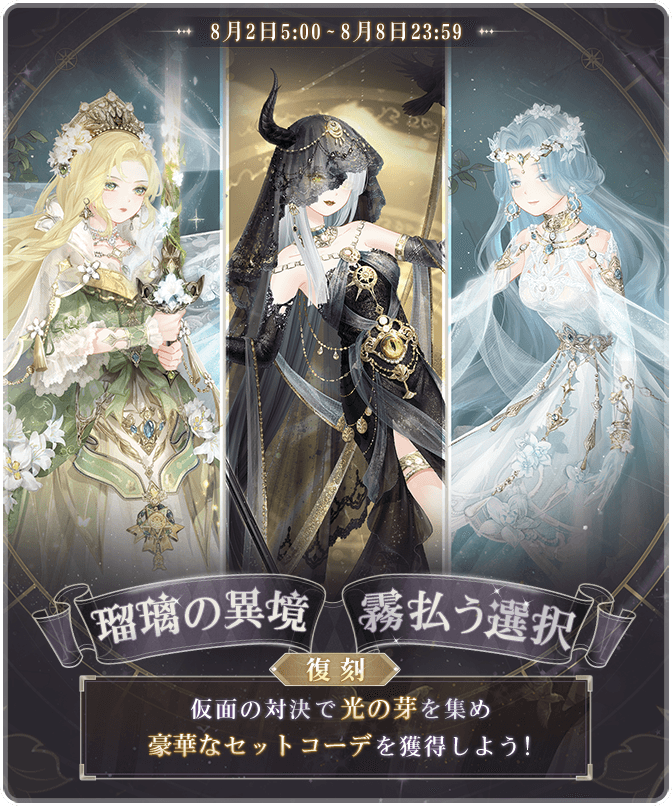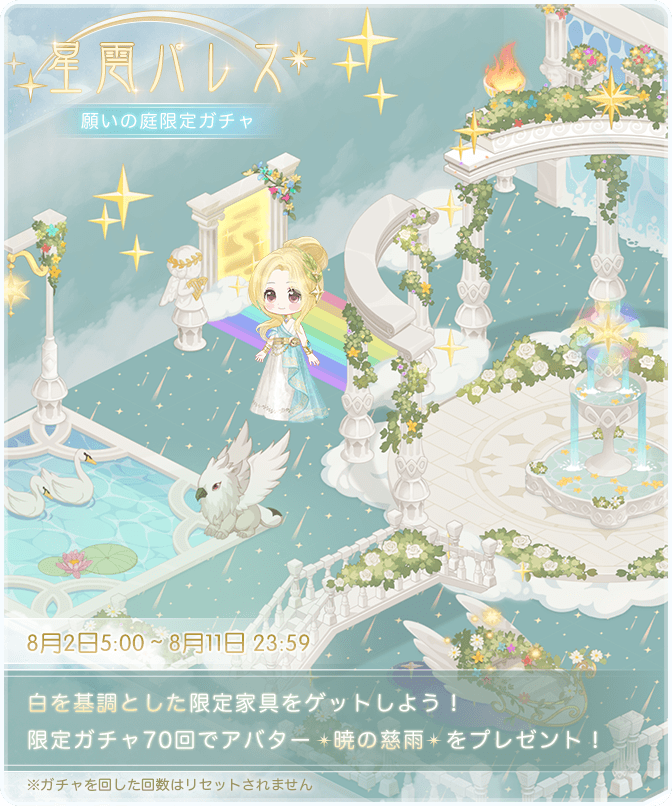 ニキハウス限定ガチャ『星雲パレス』開催! ![]() 【イベント①】ニキハウス限定ガチャ『星雲パレス』 ▼期間:8月2日5:00~8月11日23:59 ▼内容:願いの庭限定ガチャで白を基調とした限定家具をゲットしよう! 限定ガチャ70回でアバター「暁の慈雨」をプレゼント! ※ガチャを回した回数はリセットされません ![]() 【イベント②】復刻『瑠璃の異境 霧払う選択』 ▼期間:8月2日5:00~8月8日23:59 ▼内容:仮面の対決で、光の芽を集め、豪華なセットコーデを獲得しよう! イベント期間中、お得な光の芽BOXも販売されます♪ ![]() 【イベント③】スターコイン2倍キャンペーン ▼期間:8月8日5:00~8月10日23:59 ▼内容:イベント期間中コーデコロッセオで獲得できるスターコインが2倍になります! Twitter限定のおトクキャンペーン情報などもお送りするので、 お見逃しないようぜひフォローをお願いいたします! https://twitter.com/miraclenikkijp 『ミラクルニキ』運営チーム |