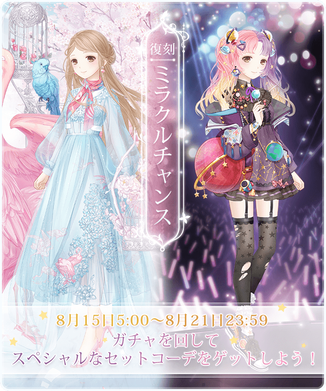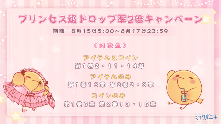 復刻『ミラクルチャンス』開催! ![]() 【イベント①】復刻『ミラクルチャンス』 ▼期間:8月15日5:00~8月21日23:59 ▼内容:ガチャを回して、スペシャルなセットコーデをゲットしよう! ![]() 【イベント②】プリンセス級ドロップ率2倍キャンペーン ▼期間:8月15日5:00~8月17日23:59 ▼内容:期間中、プリンセス級の対象章でアイテムやコインのドロップ率が2倍になります! 《対象章》 アイテムとコイン:第1巻2・11・14章 アイテムのみ:第1巻13章 第2巻2・3章 コインのみ:第1巻6章 第2巻13・15章 ![]() 【イベント③】「記憶の館」 ▼期間:8月16日5:00~8月19日23:59 ▼内容:イベント期間中、過去のチャージ特典がランダムで販売! ※未所持のチャージ特典のみ表示されます ※すべて所持されている場合は表示されません Twitter限定のおトクキャンペーン情報などもお送りするので、 お見逃しないようぜひフォローをお願いいたします! https://twitter.com/miraclenikkijp 『ミラクルニキ』運営チーム |