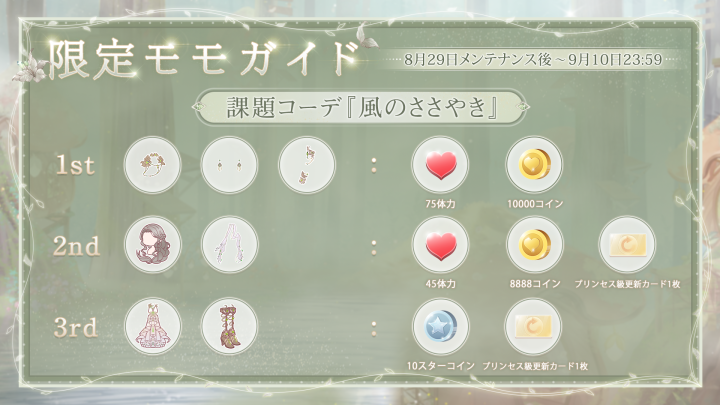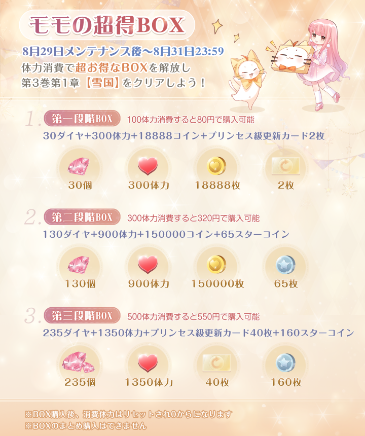 スターコイン2倍キャンペーン開催! ![]() 【イベント①】スターコイン2倍キャンペーン ▼期間:8月29日5:00~8月31日23:59 ▼内容:イベント期間中コーデコロッセオで獲得できるスターコインが2倍になります! ※メンテナンス中はアプリにログインできないため参加できません ![]() 【イベント②】モモの超得BOX販売 ▼期間:8月29日メンテナンス後~8月31日23:59 ▼内容:体力消費で超お得なBOXを解放し、第3巻1章【雪国】をクリアしよう! 詳細は画像をチェック! ![]() 【イベント③】限定モモガイドイベント ▼期間:8月29日メンテナンス後~9月10日23:59 ▼内容:期間内にセットコーデ『風のささやき』を完成させ豪華報酬を獲得しよう! 今回は報酬が3段階に分かれています! ![]() 【イベント④】「記憶の館」 ▼期間:8月22日5:00~8月28日23:59 ▼内容:イベント期間中、過去のチャージ特典がランダムで販売! ※未所持のチャージ特典のみ表示されます ※すべて所持されている場合は表示されません Twitter限定のおトクキャンペーン情報などもお送りするので、 お見逃しないようぜひフォローをお願いいたします! https://twitter.com/miraclenikkijp 『ミラクルニキ』運営チーム |