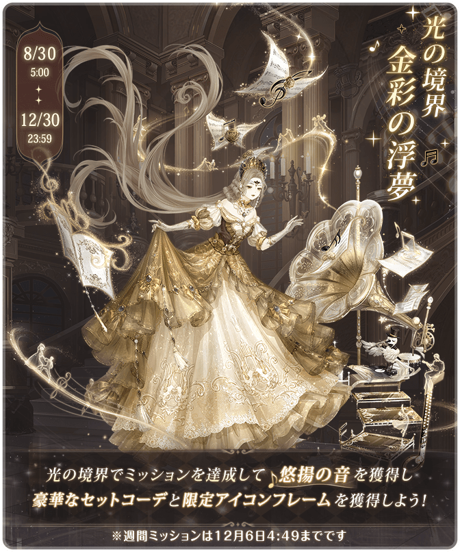 『光の境界 金彩の浮夢』開催! ![]() 【イベント①】『光の境界 金彩の浮夢』 ▼期間:8月30日5:00~12月30日23:59 ▼内容:光の境界でミッションを達成して悠揚の音を獲得し 豪華なセットコーデと限定アイコンフレームを獲得しよう! ※週間ミッションは12月6日4:49までです Twitter限定のおトクキャンペーン情報などもお送りするので、 お見逃しないようぜひフォローをお願いいたします! https://twitter.com/miraclenikkijp 『ミラクルニキ』運営チーム |