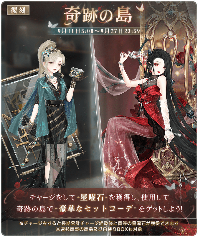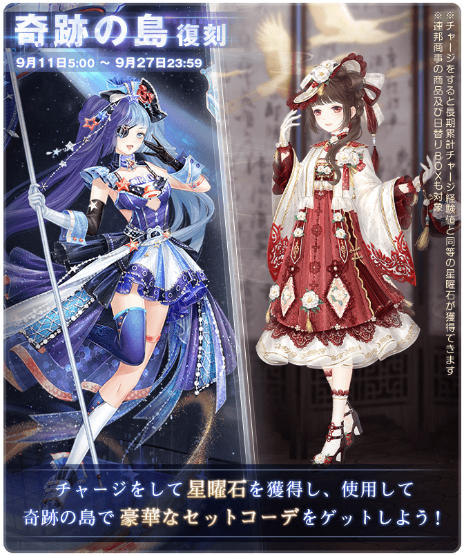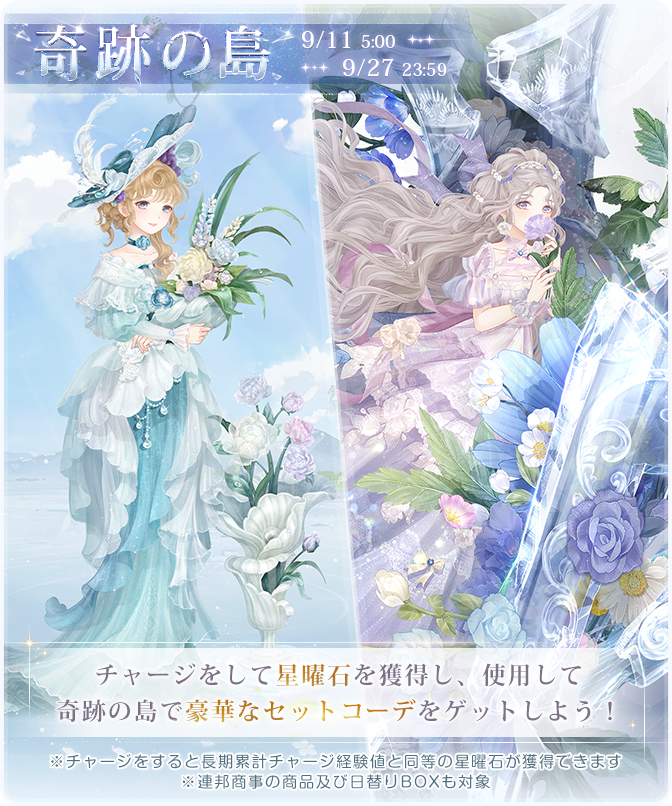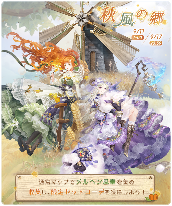 『秋風の郷』開催! ![]() 【イベント①】『秋風の郷』 ▼期間:9月11日5:00~9月17日23:59 ▼内容:通常マップでメルヘン風車を集め、収集し、限定セットコーデを獲得しよう! イベント期間中、お得なメルヘン風車BOXも販売されます♪ ![]() ![]() ![]() 【イベント②】『奇跡の島』 ▼期間:9月11日5:00~9月27日23:59 ▼内容:チャージをして星曜石を獲得し、使用して、奇跡の島で豪華なセットコーデをゲットしよう! なお同時に過去に販売したセットコーデも復刻販売されます! ※連邦商事の商品及び日替りBOXも対象 ![]() 【イベント③】プリンセス級ドロップ率2倍キャンペーン ▼期間:9月12日5:00~9月14日23:59 ▼内容:期間中、プリンセス級の対象章でアイテムやコインのドロップ率が2倍になります! 《対象章》 アイテムとコイン:第1巻第12・13章 第2巻第5章 アイテムのみ:第1巻第6章 第2巻第11・12章 コインのみ:第1巻第11・14章 第2巻第6章 Twitter限定のおトクキャンペーン情報などもお送りするので、 お見逃しないようぜひフォローをお願いいたします! https://twitter.com/miraclenikkijp 『ミラクルニキ』運営チーム |