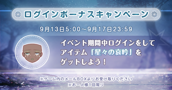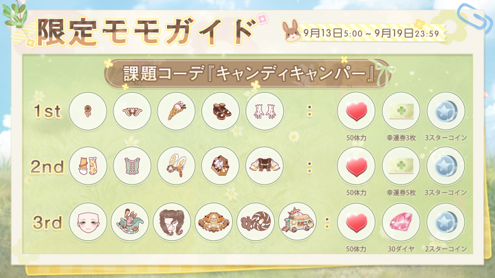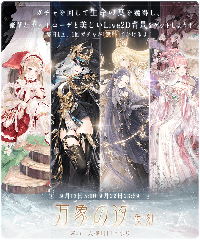 復刻『万象の汐』開催! ![]() 【イベント①】復刻『万象の汐』 ▼期間:9月13日5:00~9月22日23:59 ▼内容:ガチャを回して生命の葉を獲得し、豪華なセットコーデコーデと美しいLive2D背景をゲットしよう! 毎日1回【1回ガチャ】が無料でひけるよ! ※割引はお一人様1回限り ![]() 【イベント②】ログインボーナスキャンペーン ▼期間:9月13日5:00~9月17日23:59 ▼内容:イベント期間中ログインをしてアイテム「星々の哀吟」をゲットしよう! ![]() 【イベント③】限定モモガイドイベント ▼期間:9月13日5:00~9月19日23:59 ▼内容:期間内にセットコーデ『キャンディキャンパー』を完成させ豪華報酬を獲得しよう! 今回は報酬が3段階に分かれています! 【イベント④】お得BOX販売 ▼期間:9月13日5:00~9月17日23:59 ▼内容:期間中、80円で下記豪華報酬をゲットしよう! ■30ダイヤ ■120体力 ■23333コイン ■12ギルドコイン ■プリンセス級更新カード3枚 ※お一人様5個まで Twitter限定のおトクキャンペーン情報などもお送りするので、 お見逃しないようぜひフォローをお願いいたします! https://twitter.com/miraclenikkijp 『ミラクルニキ』運営チーム |