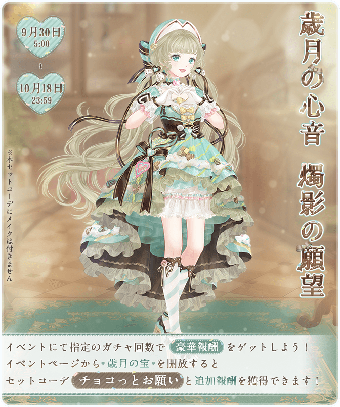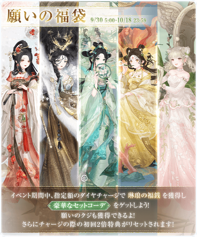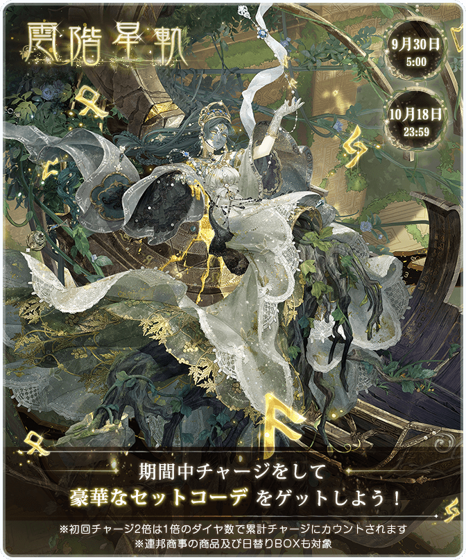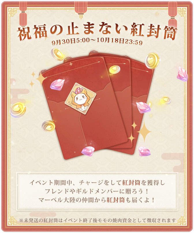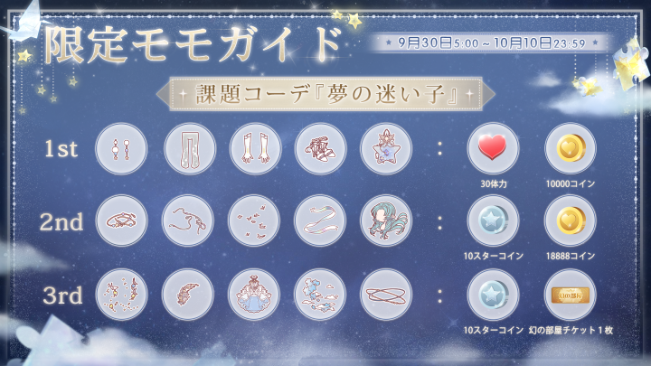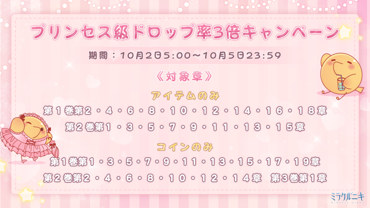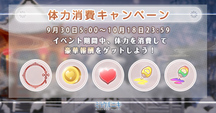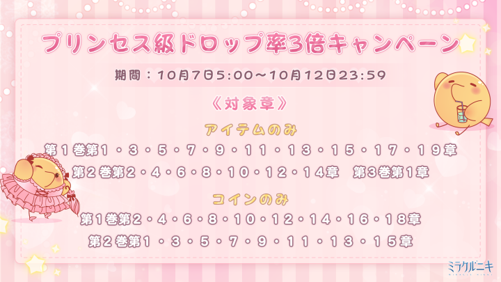 『星眠らぬ夜』開催! ![]() 【イベント①】『星眠らぬ夜』 ▼期間:9月30日5:00~10月18日23:59 ▼内容:期間中、様々なイベントに参加し豪華なセットコーデや報酬をゲットしよう! 「星夢の書」のストーリーを全て読むと背景「時空の迷路」を獲得できます! ![]() 【イベント②】『時間の迷域 無秩序の輪』 ▼期間:9月30日5:00~10月18日23:59 ▼内容:鏡の中の歳月の漣を見つめ、ガチャを回し豪華なセットコーデを獲得しよう! イベント期間中、お得な星海図BOXも販売されます♪ ※ランキング報酬とガチャ返還の受取は10月19日23:59まで ![]() 【イベント③】『歳月の心音 燭影の願望』 ▼期間:9月30日5:00~10月18日23:59 ▼内容:イベントにて指定のガチャ回数で豪華報酬をゲットしよう! イベントページから歳月の宝を開放すると セットコーデ『チョコっとお願い』と追加報酬を獲得できます! ![]() 【イベント④】『雲階星軌』 ▼期間:9月30日5:00~10月18日23:59 ▼内容:期間中チャージをして豪華なセットコーデをゲットしよう! 同イベントの過去のセットコーデも復刻します! ※初回チャージ2倍は1倍のダイヤ数で累計チャージにカウントされます ※連邦商事の商品及び日替りBOXも対象 ![]() 【イベント⑤】第19回光のギャラリーコンテスト ▼期間:9月30日5:00~10月18日23:59 ▼内容:光のギャラリーであなただけの夢幻の旅を描こう! 期間中にコーデを投稿するだけでエントリーが完了し、参加特典がもらえます! トップ50にランクインすると豪華報酬が獲得できます! ![]() 【イベント⑥】『彩錦収集』 ▼期間:9月30日5:00~10月18日23:59 ▼内容:期間中、様々なイベントに参加し豪華なセットコーデや報酬をゲットしよう! ![]() 【イベント⑥】『願いの福袋』 ▼期間:9月30日5:00~10月18日23:59 ▼内容:イベント期間中、指定額のダイヤチャージで琳琅の福銭を獲得し豪華なセットコーデをゲットしよう! 願いのクジも獲得できるよ! さらにチャージの際の初回2倍特典がリセットされます! ![]() 【イベント⑦】『祝福の止まない紅封筒』 ▼期間:9月30日5:00~10月18日23:59 ▼内容:イベント期間中、チャージをして紅封筒を獲得しフレンドやギルドメンバーに贈ろう! マーベル大陸の仲間から紅封筒も届くよ! ![]() 【イベント⑧】『金蛇の財運招福』 ▼期間: 開催期間:9月30日5:00~10月18日23:59 受取期間:10月12日0:00~10月18日23:59 ▼内容:イベント期間中、ログインをしてイベントページからセットコーデ『金蛇の財』をゲットしよう! ![]() 【イベント⑨】体力消費キャンペーン ▼期間:9月30日5:00~10月18日23:59 ▼内容:イベント期間中、体力を消費して豪華報酬をゲットしよう! ![]() 【イベント⑩】限定モモガイド ▼期間:9月30日5:00~10月10日23:59 ▼内容:期間内にセットコーデ『夢の迷い子』を完成させ豪華報酬を獲得しよう! 今回は報酬が3段階に分かれています! ![]() 【イベント⑪】ログインボーナスキャンペーン ▼期間:9月30日5:00~10月18日23:59 ▼内容:イベント期間中にログインをしてセットコーデ『美味しい日記』のデザイン図をゲットしよう! ※お一人様1回限り ※ゲーム内のメールBOXよりお受け取りください ![]() 【イベント⑫】プリンセス級ドロップ率3倍キャンペーン ▼期間:10月2日5:00~10月5日23:59 ▼内容:プリンセス級の対象章で獲得できるアイテムやコインのドロップ率が3倍になります! 《対象章》 アイテム:第1巻偶数章・第2巻奇数章 コイン:第1巻奇数章・第2巻偶数章・第3巻第1章 【イベント⑬】お得BOX販売 ▼期間:10月4日5:00~10月10日23:59 ▼内容:期間中、80円で下記豪華報酬をゲットしよう! ■30ダイヤ ■120体力 ■幻の部屋チケット2枚 ■50000コイン ※お一人様5個まで ![]() 【イベント⑭】プリンセス級ドロップ率3倍キャンペーン ▼期間:10月7日5:00~10月12日23:59 ▼内容:プリンセス級の対象章で獲得できるアイテムやコインのドロップ率が3倍になります! 《対象章》 アイテム:第1巻奇数章・第2巻偶数章・第3巻第1章 コイン:第1巻偶数章・第2巻奇数章 ![]() 【イベント⑮】スターコイン2倍キャンペーン ▼期間:10月7日5:00~10月12日23:59 ▼内容:イベント期間中コーデコロッセオで獲得できるスターコインが2倍になります! Twitter限定のおトクキャンペーン情報などもお送りするので、 お見逃しないようぜひフォローをお願いいたします! https://twitter.com/miraclenikkijp 『ミラクルニキ』運営チーム |