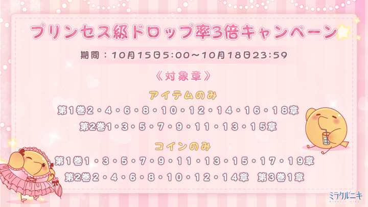 復刻『夢の解析 感情の力』開催! ![]() 【イベント①】復刻『夢の解析 感情の力』 ▼期間:10月14日5:00~10月23日23:59 ▼内容:夢織り世界でガチャを回して、豪華なセットコーデと可愛いLive2Dコーデを獲得しよう! ![]() 【イベント②】プリンセス級ドロップ率3倍キャンペーン ▼期間:10月15日5:00~10月18日23:59 ▼内容:期間中プリンセス級の対象章で獲得できるアイテムやコインのドロップ率が3倍になります! 《対象章》 アイテム:第1巻偶数章・第2巻奇数章 コイン:第1巻奇数章・第2巻偶数章・第3巻第1章 Twitter限定のおトクキャンペーン情報などもお送りするので、 お見逃しないようぜひフォローをお願いいたします! https://twitter.com/miraclenikkijp 『ミラクルニキ』運営チーム |