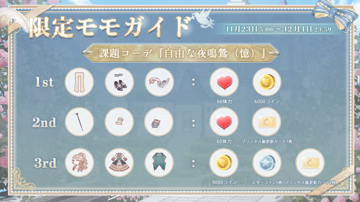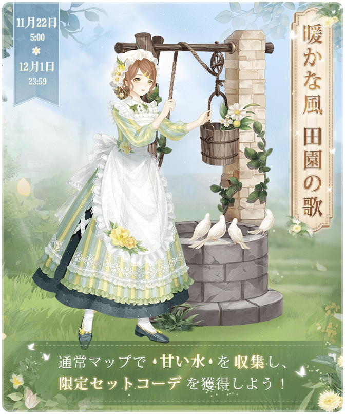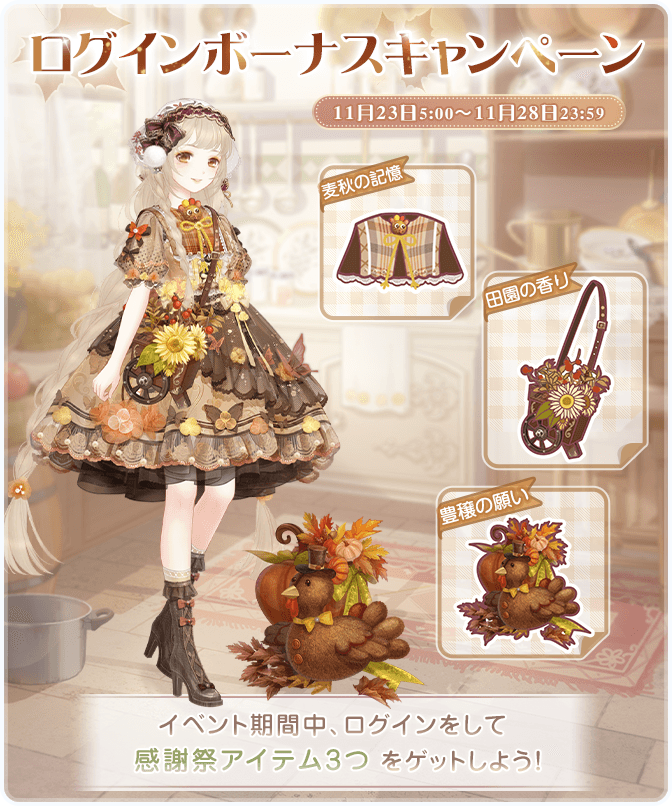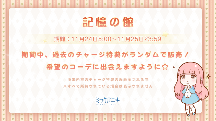 『暖かな風 田園の歌』開催! ![]() 【イベント①】『暖かな風 田園の歌』 ▼期間:11月22日5:00~12月1日23:59 ▼内容:通常マップで甘い水を収集し、限定セットコーデを獲得しよう! イベント期間中、お得な甘い水BOXも販売されます♪ ![]() 【イベント②】ログインボーナスキャンペーン ▼期間:11月23日5:00~11月28日23:59 ▼内容:イベント期間中ログインをして感謝祭アイテム3つをゲットしよう! ![]() 【イベント③】限定モモガイド ▼期間:11月23日5:00~12月4日23:59 ▼内容:期間内にセットコーデ『自由な夜鳴鶯(憶)』を完成させ豪華報酬を獲得しよう! 今回は報酬が3段階に分かれています! ![]() 【イベント④】「記憶の館」 ▼期間:11月24日5:00~11月25日23:59 ▼内容:イベント期間中、過去のチャージ特典がランダムで販売! ※未所持のチャージ特典のみ表示されます ※すべて所持されている場合は表示されません Twitter限定のおトクキャンペーン情報などもお送りするので、 お見逃しないようぜひフォローをお願いいたします! https://twitter.com/miraclenikkijp 『ミラクルニキ』運営チーム |