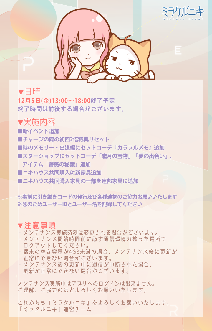 12月5日(金)メンテナンス実施のお知らせ ![]() いつも『ミラクルニキ』をプレイしていただき誠にありがとうございます。 下記の日程にてメンテナンスを実施いたします。 事前に引き継ぎコードの発行及び端末の空き容量確保にご協力ください。 ▼日時 12月5日(金)13:00~18:00終了予定 終了時間は前後する場合がございます。 ▼実施内容 ■新イベント追加 ■チャージの際の初回2倍特典リセット ■時のメモリー・出逢編にセットコーデ『カラフルメモ』追加 ■スターショップにセットコーデ『歳月の宝物』『夢の出会い』、アイテム「薔薇の秘鏡」追加 ■ニキハウス共同購入に新家具追加 ■ニキハウス共同購入家具の一部を連邦家具に追加 ※事前に引き継ぎコードの発行及び各種連携のご協力お願いいたします ※念のためユーザーIDとユーザー名を記録してください ▼注意事項 ・メンテナンスの開始時間、および終了時間は変更する場合がございます。 ・メンテナンス開始時間前に必ず通信環境の整った場所でログアウトしてください。 ・端末の空き容量が4GB未満の場合、メンテナンス後に更新が正常にできない場合がございます。 ・メンテナンス後の更新中に通信が中断された場合、更新が正常にできない場合がございます。 メンテナンス実施中はゲームの起動及び接続を行うことが出来ません。 ご理解、ご協力のほどよろしくお願いいたします。 これからも『ミラクルニキ』をよろしくお願いいたします。 『ミラクルニキ』運営チーム Twitter限定のおトクキャンペーン情報などもお送りするので、 お見逃しないようぜひフォローをお願いいたします! https://twitter.com/miraclenikkijp 『ミラクルニキ』運営チーム |