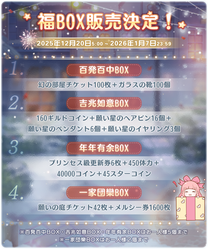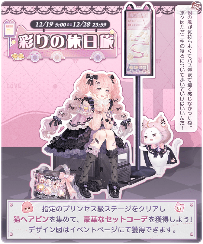 『彩りの休日旅』開催! ![]() 【イベント①】『彩りの休日旅』 ▼期間:12月19日5:00~12月28日23:59 ▼内容:指定のプリンセス級ステージをクリアし猫ヘアピンを集めて、豪華なセットコーデを獲得しよう! デザイン図はイベントページにて獲得できます。 イベント期間中、お得な猫ヘアピンBOXも販売されます♪ ![]() 【イベント②】限定BOX発売 ▼期間:2025年12月20日5:00~2026年1月7日23:59 ▼内容:イベント期間中、連邦商事にて4種類のBOXが販売されます! ※各BOXに個数制限があります 【イベント③】光の特急BOX販売 ▼期間:12月23日5:00~12月30日23:59 ▼内容:期間中、連邦商事にて数量限定で販売決定! ○光の特急BOX(S) 悠揚の音36個+20体力+7スターコイン ○光の特急BOX(L) 悠揚の音130個+80体力+50000コイン BOXの販売は最後となりますので、ご注意ください! 【イベント④】お得BOX販売 ▼期間:12月23日5:00~12月27日23:59 ▼内容:期間中、80円で下記豪華報酬をゲットしよう! ■30ダイヤ ■150体力 ■15ギルドコイン ■プリンセス級更新カード3枚 ※お一人様5個まで ![]() 【イベント⑤】クリスマスログインボーナスキャンペーン ▼期間:12月23日5:00~12月29日23:59 ▼内容:期間中、ログインをしてクリスアイテム2つをゲットしよう! Twitter限定のおトクキャンペーン情報などもお送りするので、 お見逃しないようぜひフォローをお願いいたします! https://twitter.com/miraclenikkijp 『ミラクルニキ』運営チーム |