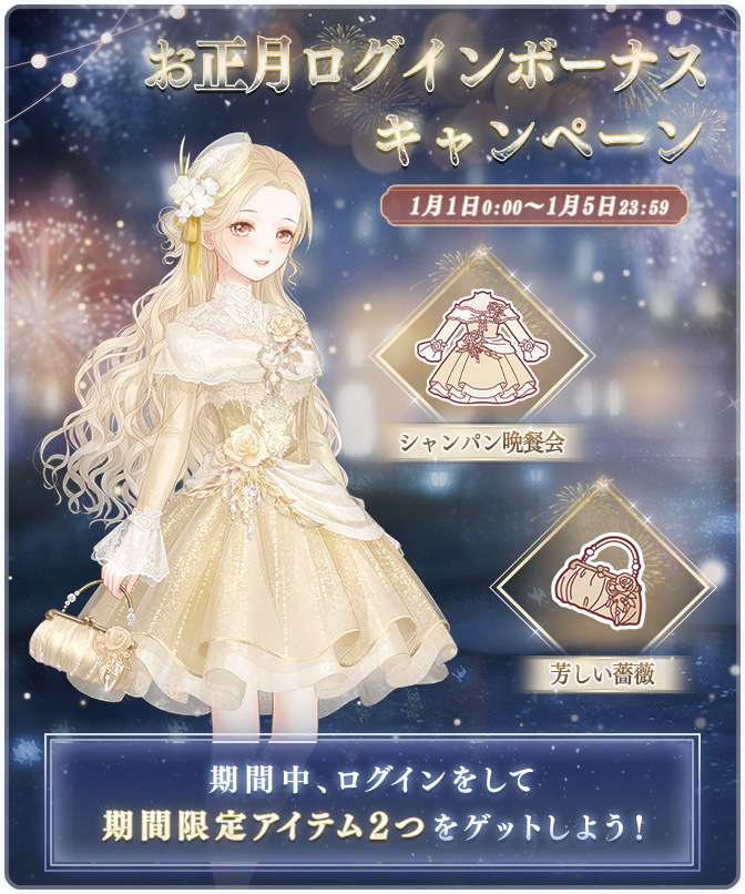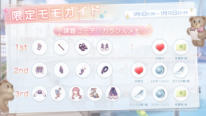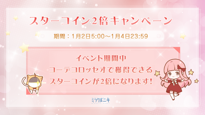 お正月ログインボーナスキャンペーン開催! ![]() 【イベント①】お正月ログインボーナスキャンペーン ▼期間:1月1日0:00~1月5日23:59 ▼内容:期間中、ログインをして期間限定アイテム2つをゲットしよう! ![]() 【イベント②】限定モモガイドイベント ▼期間:1月1日5:00~1月12日23:59 ▼内容:期間内にセットコーデ『カラフルメモ』を完成させ豪華報酬を獲得しよう! 今回は報酬が3段階に分かれています! ![]() 【イベント③】スターコイン2倍キャンペーン ▼期間:1月2日5:00~1月4日23:59 ▼内容:イベント期間中コーデコロッセオで獲得できるスターコインが2倍になります! Twitter限定のおトクキャンペーン情報などもお送りするので、 お見逃しないようぜひフォローをお願いいたします! https://twitter.com/miraclenikkijp 『ミラクルニキ』運営チーム |