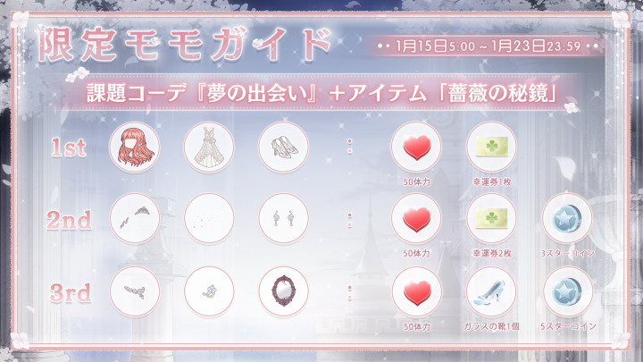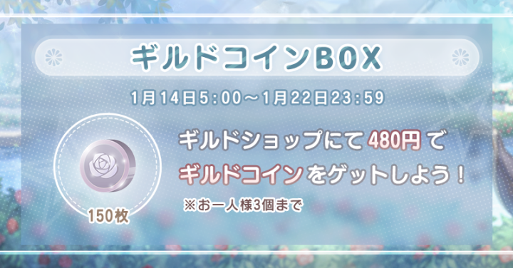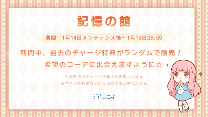 『ギルドコインBOX』発売! ![]() 【イベント①】『ギルドコインBOX』 ▼期間:1月14日メンテナンス後~1月22日23:59 ▼内容:イベント期間中にギルドショップにてギルドコインBOXが発売されます! 480円でギルドコイン150枚をゲットしよう! ※お一人様3個まで ![]() 【イベント②】「記憶の館」 ▼期間:1月14日メンテナンス後~1月15日23:59 ▼内容:イベント期間中、過去のチャージ特典がランダムで販売! ※未所持のチャージ特典のみ表示されます ※すべて所持されている場合は表示されません ![]() 【イベント③】限定モモガイドイベント ▼期間:1月15日5:00~1月23日23:59 ▼内容:期間内にセットコーデ『夢の出会い』+アイテム「薔薇の秘鏡」を完成させ、豪華報酬を獲得しよう! 今回は報酬が3段階に分かれています! Twitter限定のおトクキャンペーン情報などもお送りするので、 お見逃しないようぜひフォローをお願いいたします! https://twitter.com/miraclenikkijp 『ミラクルニキ』運営チーム |