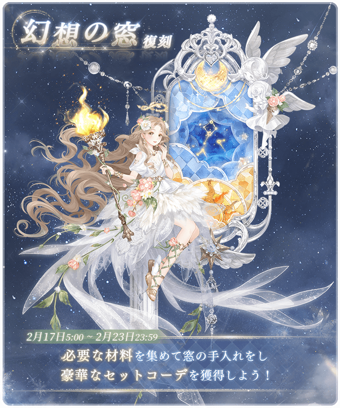 復刻『幻想の窓』開催! ![]() 【イベント①】復刻『幻想の窓』 ▼期間:2月17日5:00~2月23日23:59 ▼内容:必要な材料を集めて窓の手入れをし、豪華なセットコーデを獲得しよう! ![]() 【イベント②】「記憶の館」 ▼期間:2月17日5:00~2月19日23:59 ▼内容:イベント期間中、過去のチャージ特典がランダムで販売! ※未所持のチャージ特典のみ表示されます ※すべて所持されている場合は表示されません Twitter限定のおトクキャンペーン情報などもお送りするので、 お見逃しないようぜひフォローをお願いいたします! https://twitter.com/miraclenikkijp 『ミラクルニキ』運営チーム |