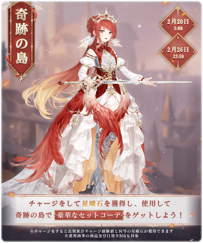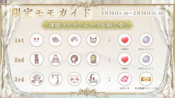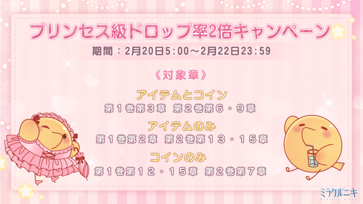 『碧のそよ風 楽しい童話』開催! ![]() 【イベント①】『碧のそよ風 楽しい童話』 ▼期間:2月20日5:00~2月26日23:59 ▼内容:テーマに合うコーデを選択し、碧の栞を集めて、豪華なセットコーデを獲得しよう! イベント期間中、お得な碧の栞BOXも販売されます♪ ![]() ![]() 【イベント②】『奇跡の島』 ▼期間:2月20日5:00~2月26日23:59 ▼内容:チャージをして星曜石を獲得し、使用して、奇跡の島で豪華なセットコーデをゲットしよう! なお同時に過去に販売したセットコーデも復刻販売されます! ※連邦商事の商品及び日替りBOXも対象 ![]() 【イベント③】限定モモガイドイベント『レースが紡ぐ夢』 ▼期間:2月20日5:00~2月26日23:59 ▼内容:期間内にセットコーデ『モダンスタイル』を完成させ豪華報酬を獲得しよう! 今回は報酬が3段階に分かれています! 【イベント④】お得BOX ▼期間:2月20日5:00~2月24日23:59 ▼内容:期間中、80円で下記豪華報酬をゲットしよう! ■30ダイヤ ■120体力 ■20スターコイン ■幸運券10枚 ※お一人様5個まで ![]() 【イベント⑤】プリンセス級ドロップ率2倍キャンペーン ▼期間:2月20日5:00~2月22日23:59 ▼内容:期間中、プリンセス級の対象章でアイテムやコインのドロップ率が2倍になります! 《対象章》 アイテムとコイン:第1巻第3章 第2巻第6・9章 アイテムのみ:第1巻第2章 第2巻第13・15章 コインのみ:第1巻第12・15章 第2巻第7章 Twitter限定のおトクキャンペーン情報などもお送りするので、 お見逃しないようぜひフォローをお願いいたします! https://twitter.com/miraclenikkijp 『ミラクルニキ』運営チーム |